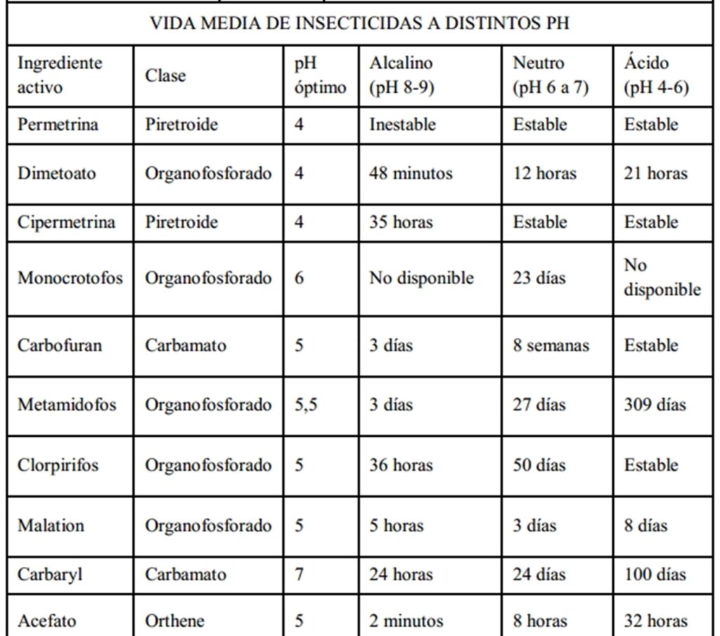 pH óptimo y vida media de soluciones de tratamientos fitosanitarios