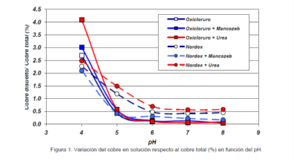 El pH es un factor importante a tener en cuenta en el momento de la preparación de las soluciones de cobre. A pH de 6 o menores, las cantidades de cobre aportadas son realmente considerables, en relación a la cantidad de cobre soluble a pH 7. Las variaciones de cobre libre en la solución del fitosanitario son importantes desde el punto de vista de la eficiencia del tratamiento fitosanitario. El pH de la solución afecta la cantidad de cobre solubilizado, ya sea utilizando oxicloruro de cobre (Fanavid 85) u óxido cuproso (Nordox 75). Cuanto menor es el pH, mayor es la solubilidad del Cu.